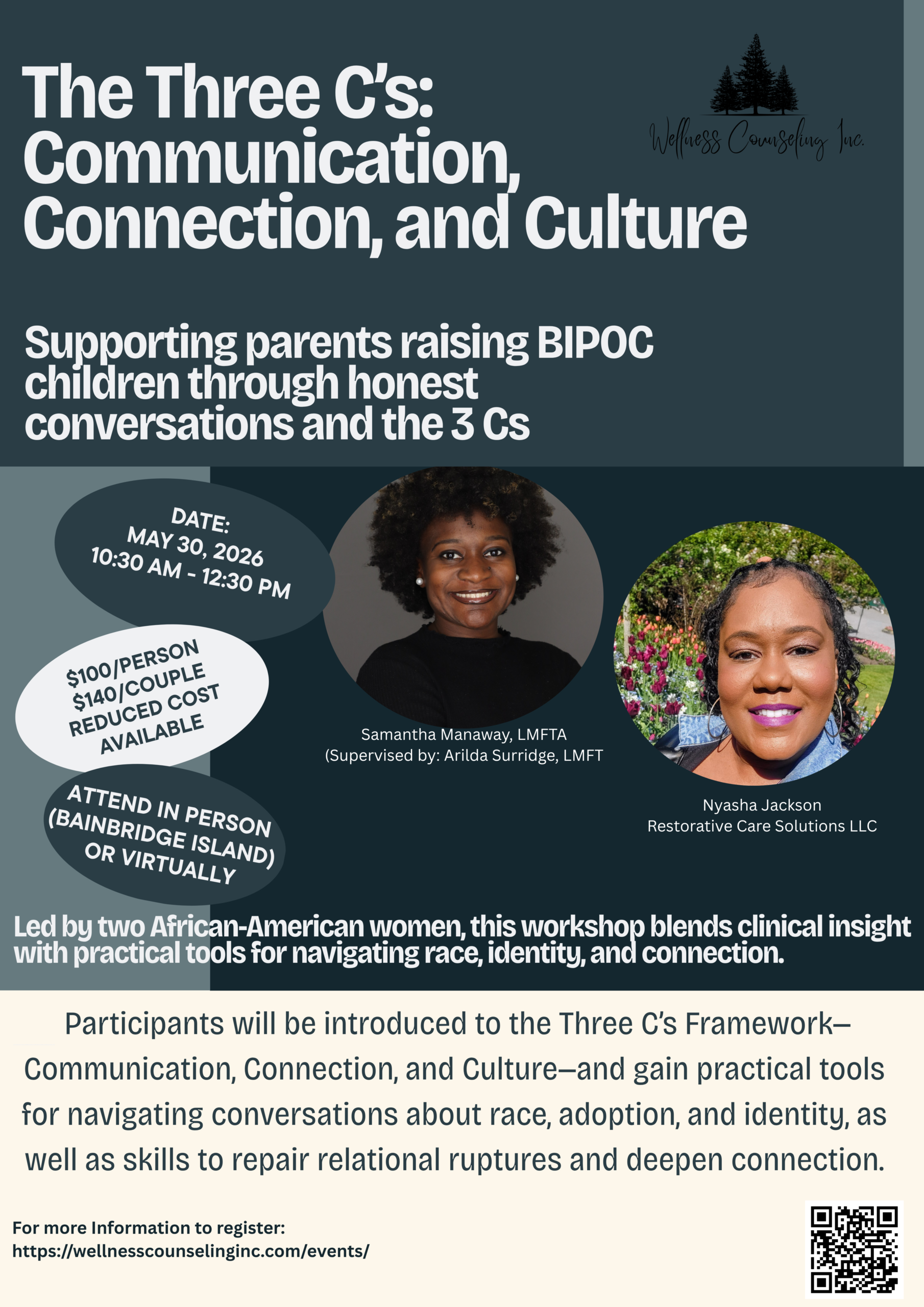 This workshop supports adoptive parents raising BIPOC children in predominantly white spaces by strengthening their ability to engage in honest, developmentally appropriate, and culturally responsive conversations about race, identity, belonging, and love. Parents will learn to lean into differences while remaining emotionally regulated, connected, and attuned to their child’s lived experiences. The workshop also highlights how BIPOC adoptees may experience racialized stress during critical stages of identity development. Participants will be introduced to the Three C’s Framework-Communication, Connection, and Culture-and gain practical tools for navigating conversations about race, adoption, and identity, as well as skills to repair relational ruptures and deepen connection.